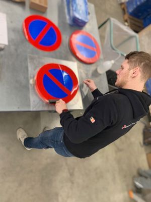 Après cela, les 4 cotés du panneau seront pliés deux fois d’angle et dans les coins une pièce sera soudée afin de créer un panneau durable. Suite à cela, un profil de glissière sera soudé afin de pouvoir attacher le panneau. Le nombre des profils dépend de la hauteur du panneau. Enfin, l'arrière du panneau sera revêtu de gris ou orange. Nous appelons ça un panneau SB250 comme prescrit par le Gouvernement Wallon. Les panneaux de forme ronde reçoivent un bord plié par l’utilisation d’une autre machine.