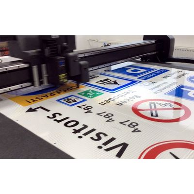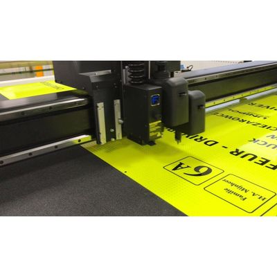 Quand l'impression est faite et que le laminé anti-graffiti est placé, le film réfléchissant est placée sur une table de découpe. Celle-ci est équipé de caméra qui détecte les fichiers qui ont été préalablement injecter sur l'ordinateur. Peu importe la forme la machine découpe facilement et rapidement les autocollants.